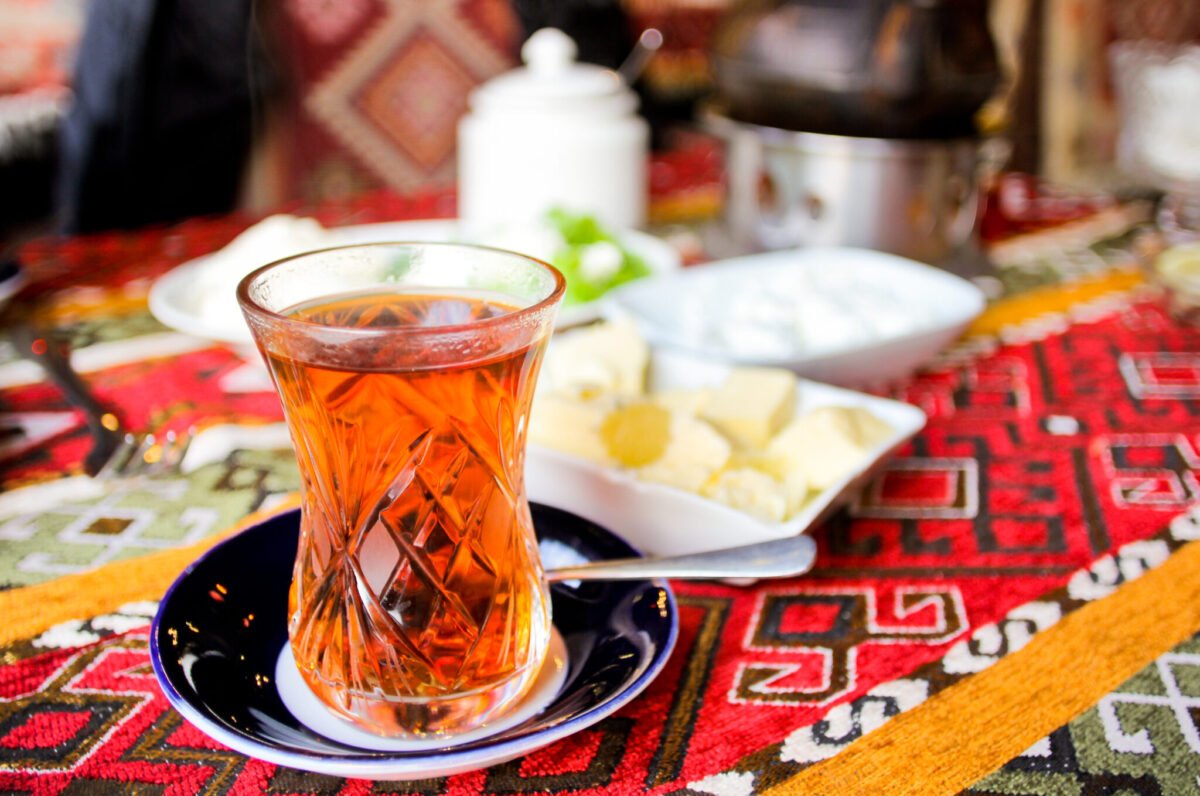 К чаю подают варенье, кусковой сахар (очень распространён) или сладости, типов пахлавы и ката. Чай с сахаром пьют вприкуску. Это сильно отличимо от турецкого варианта чаепития, гду сахар добавляют в чай. Перед тем как отпить первый глоток, непременно окунают сахар в чай, чтобы он стал мягче, затем откусывают.